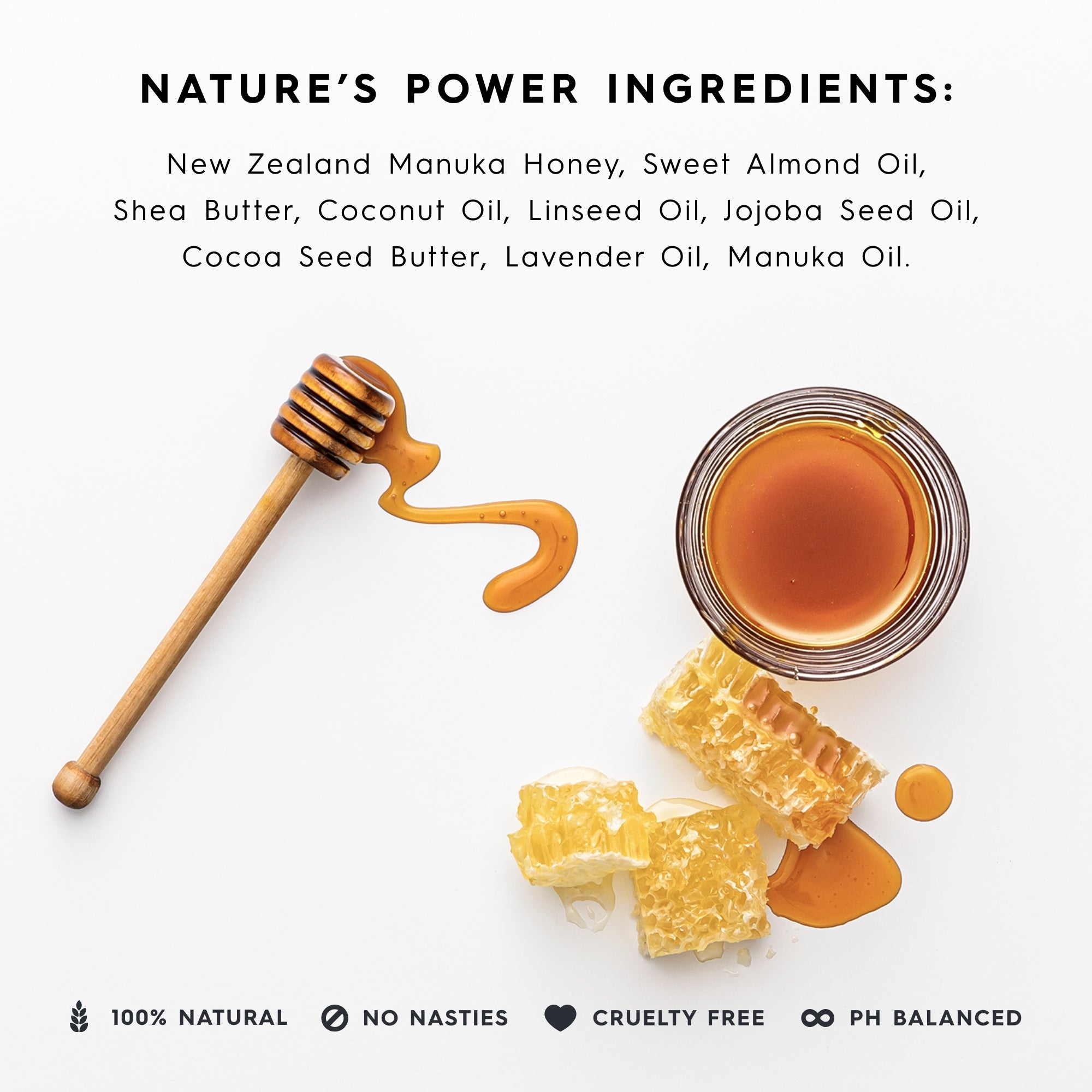New Zealand Manuka Honey, Sweet Almond Oil, Shea Butter, Coconut Oil, Linseed Oil, Jojoba Seed Oil, Cocoa Seed Butter, Lavender Oil, Manuka Oil.
