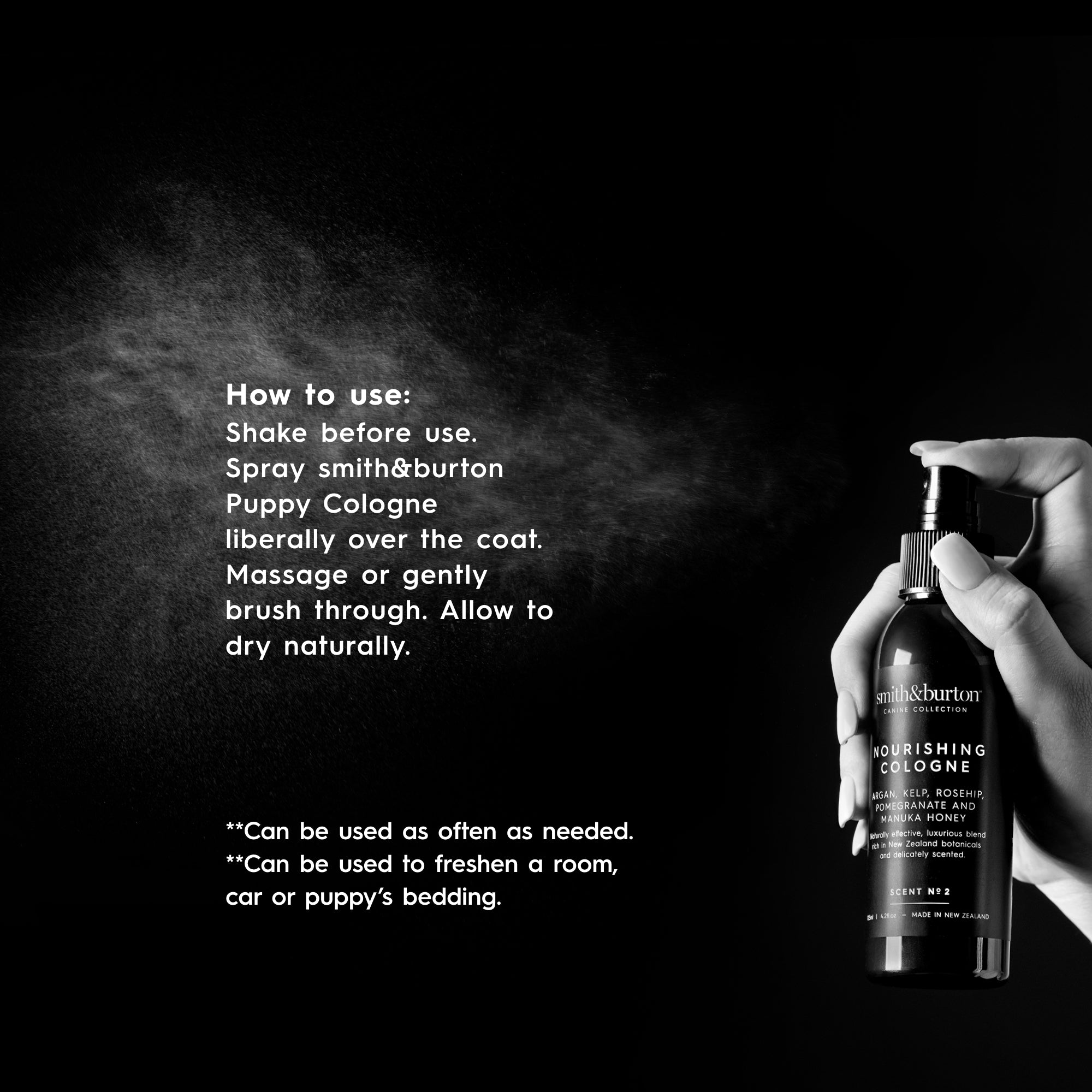 Shake before use. Spray liberally over the coat. Massage or gently brush through. Allow to dry naturally.